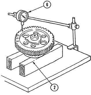 SUPPORT CAMSHAFT DRIVE GEAR THRUST PLATE (2), AS SHOWN. WITH DIAL INDICATOR (6),